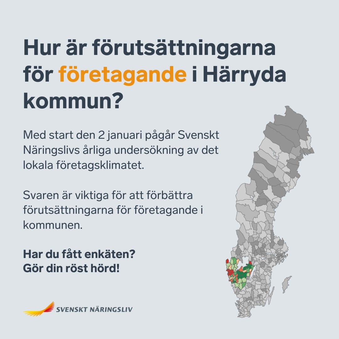 Svenskt näringsliv har skickat ut sin enkät i dagarna om hur du som företagare ser på det lokala företagsklimatet. Ju fler som svarar - desto bättre underlag för oss på Härryda kommun att arbeta med utvecklingen av företagsklimatet.
